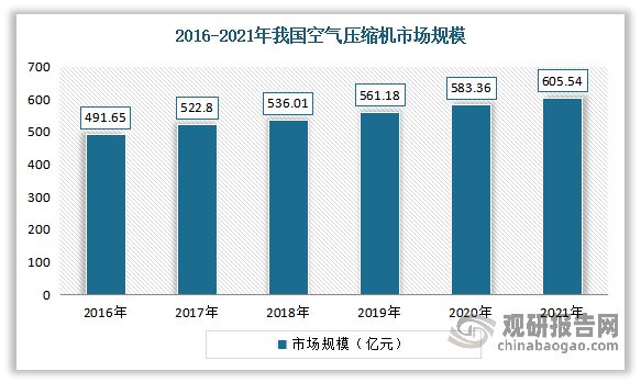 自2012年以來,我國空氣壓縮機行業(yè)市場規(guī)模呈逐年上升態(tài)勢。從國內(nèi)空氣壓縮機行業(yè)銷售額來看,2020年我國空氣壓縮機市場規(guī)模從2016年的491.65億元增長到了583.36億元。考慮到考慮到國內(nèi)節(jié)能環(huán)保相關(guān)政策日趨嚴(yán)格,行業(yè)節(jié)能改造需求將持續(xù)提升。估計2021年我國空氣壓縮機市場規(guī)??梢赃_(dá)到605.54億元。