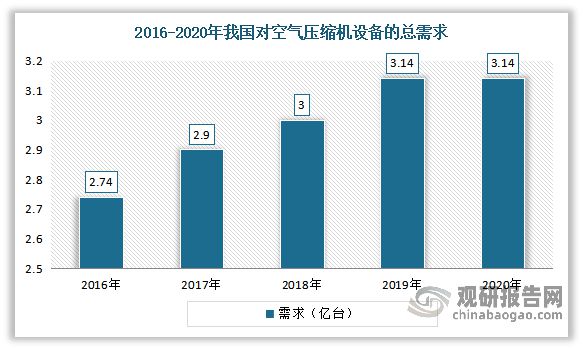 空氣壓縮機是現(xiàn)代工業(yè)的通用設(shè)備,廣泛應(yīng)用于機械制造、冶金、汽車、水泥、電力、電子、紡織等工業(yè)。進(jìn)入21世紀(jì)以來,隨著我國經(jīng)濟(jì)進(jìn)入高速增長期,工業(yè)水平的不斷提升,各行業(yè)商品貿(mào)易的日趨繁榮,對空氣壓縮機設(shè)備的總需求也在逐漸提升。2020年我國對空氣壓縮機設(shè)備的總需求在3.14億臺左右。