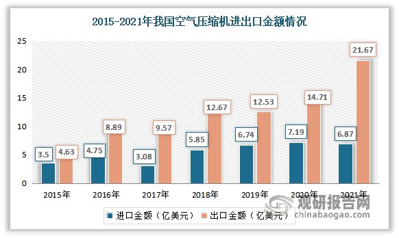 一直以來,我國空氣壓縮機進(jìn)出口市場保持著貿(mào)易順差。數(shù)據(jù)顯示,2021年我國空氣壓縮機行業(yè)進(jìn)出口總額為28.46億美元,其中出口額為21.67億美元,額為6.87億美元,實現(xiàn)貿(mào)易順差14.73億美元。