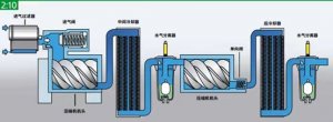 在液體式螺桿空壓機(jī)中,液體進(jìn)入壓縮室,也經(jīng)常會(huì)進(jìn)入空壓機(jī)軸承。其功能是冷卻并潤滑空壓機(jī)的運(yùn)動(dòng)部件、冷卻在內(nèi)部被壓縮的空氣,并減少返回進(jìn)氣道的泄漏。